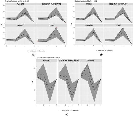 MANOVA was used to compare individual groups of athletes in all indicators. Specifically, its implementation using global envelopes [], which allows us to both globally compare individual groups of athletes in all indicators at the same time, and graphically determine which indicators are responsible for a positive test result. This graphical interpretation is made possible by envelopes (non-parametric method) that determine the non-rejection region at the 0.05 significance level. Thus, an indicator outside these envelopes is demonstrably significant at the global significance level of 0.05. In addition to comparing individual groups before and after training, we also compared the differences in results before and after training. Although these differences are non-significant, the graphical interpretation shows trends that we expect would be statistically significant if more participants were available. Between sessions comparison of parameters (separately intra-group and for all participants together) were also performed using a Wilcoxon pair test. Statistical analysis was conducted using Excel 2016 (Microsoft Corporation, Redmond, WA, USA) and IBM SPSS Statistics (IBM, Armonk, NY, USA) for Windows platform. Through Sensitivity Power Analysis, we found that the model (Power = 0.8; α = 0.05) used in the pilot study reveals differences in effect size f ≥ 0.456.
