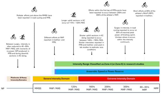 The physiological demands of these intermittent endurance events, however, are not yet fully understood. Of the studies that compared the responses between constant and variable intensity endurance exercise, only a few [23,24,59] utilized protocols that replicate the variations in intensity seen in these events. While challenging [14], future studies should aim to replicate the duration, intensity, and work-to-rest ratio of these races. Further, the performance of supramaximal efforts is common in these events. These efforts occur within the athletes’ APR. This range of intensities (from MAP to MPP) encompasses two different exercise domains (the severe and the extreme intensity domains). The factors that limit exercise within these domains are distinct in nature, and as such so are the fatigue mechanisms associated with them [61]. Distinct intensity zones might even exist within the extreme intensity domain [85]. In addition, the intensity that demarcates the severe and the extreme intensity domain is not clear, with recent studies showing that this threshold can occur at a lower percentage (120 to 130%) of the athlete’s MAP [61,85] than previously thought (approximately 136% MAP) [60]. Nevertheless, current studies report the amount of time spent at supramaximal intensities as a single intensity zone (zone 4 or zone 6, in either a 3- or 5-zone model, respectively) (Figure 1) [10,13,16,21,30]. The intensity of these efforts has also been arbitrarily classified in different studies. For example, Peiffer et al. [8] classified some of the supramaximal efforts in road cycling based on a percentage of the power output of the finishing sprint in the race. In triathlon, intense efforts have been described as surpassing a certain threshold (400 W or 600 W) [20,34] or as a percentage of the athletes’ MAnP [16]. Classifying these efforts according to a percentage of the athletes’ APR might provide a method to standardize the intensity of the efforts, while elucidating the expected physiological demands of these surges [6].