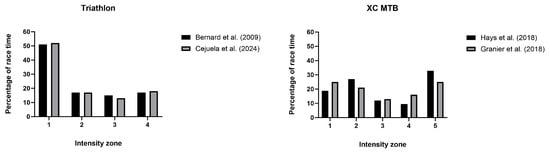 Time spent at different intensity zones during intermittent endurance events in triathlon (top) and mountain biking (bottom). Data for triathlon from Bernard et al. [16] and Cejuela et al. [30]; data for mountain biking from Granier et al. [10] and Hays et al. [21]. Training zones in triathlon correspond to: Z1: below VT1, Z2: between VT1 and VT2, Z3: between VT2 and MAP, Z4: above MAP. In MTB: Z1: no power or 10% below MAP, Z2: 10% MAP to below VT1, Z3: VT1 to VT2, Z4: VT2 to MAP, Z5: above MAP.