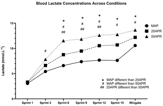 Blood lactate concentrations during a repeated sprint protocol performed, consisting of fifteen 10 s sprints at three different intensities. MAP: maximal aerobic power, 25APR: intensity associated with 25% of the participant’s APR; 50APR: intensity associated with 25% of the participant’s APR.