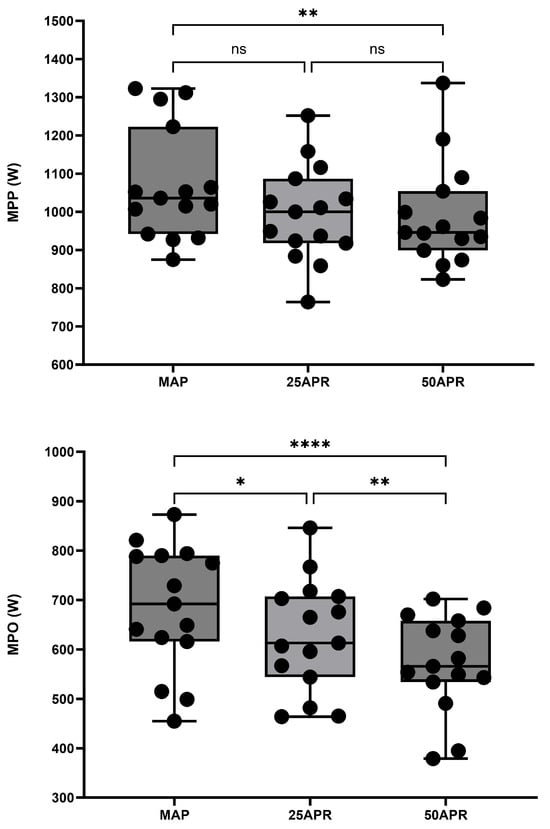 Performance during a 30 s Wingate, following the completion of the repeated sprint protocol. Each circle represents a data point. (Top panel) maximal peak power (MPP); (bottom panel) mean power during the 30 s effort. * p < 0.05, ** p < 0.01, **** p < 0.001, ns = non significant.