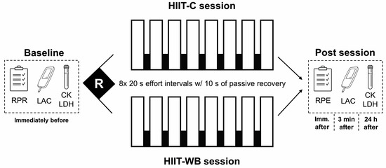 To investigate the acute responses of these protocols, peak (HRpeak) and average (HRavg) HR were measured using a heart rate monitor (RS800CX, Polar Electro, Kempele, Finland) and are expressed relative to the HRmax and HR reserve. Moreover, approximately 5 μL of blood was sampled from the participant’s earlobe before and three minutes after the end of the experimental protocols for BLa determination using a portable lactometer (LactatePlus, NOVA Biomedical™, Waltham, MA, USA). An additional 5 mL blood sample was collected from the antecubital vein before and 24 h after each protocol for CK and LDH determination. Blood was stored in heparinized tubes, which were centrifuged and stored at −20 °C until further analysis using commercial kits for CK (bio-LIFE®, Belo Horizonte, Brazil) and LDH (Diagnostic Labtest SA, Lagoa Santa, Brazil). The total concentration of the two enzymes was measured using a spectrophotometer (San Jose, CA, USA SpectraMax®), using a colorimetric UV method at a wavelength of 340 nm according to the manufacturers’ recommendations. Finally, to ensure that participants were adequately recovered before each experimental session, their recovery status was assessed using the Perceived Recovery Status Scale, as previously recommended [13]. During their first visit, all participants received instructions on how to use the scale. Before each experimental protocol, the scale was presented to the participants while they were resting comfortably in a quiet environment. In turn, RPE was measured after HIIT-C and HIIT-WB using the OMNI Picture System of Perceived Exertion, which was presented to participants following previous recommendations [14]. All participants were already previously familiarized with the RPE scale.