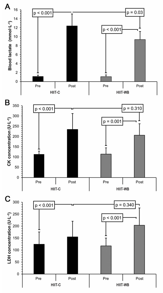A significant group × time point interaction (p = 0.005) was observed for BLa concentration, as shown in Figure 2A. Simple main effects analysis showed that BLa concentrations increased after both HIIT-C and HIIT-WB (both p < 0.001); however, post-exercise values differed according to the protocol performed (p = 0.03; ES = 1.21). More specifically, a higher BLa concentration was observed after HIIT-C (12.5 ± 2.5 mmol/L) compared to HIIT-WB (9.4 ± 1.8 mmol/L).