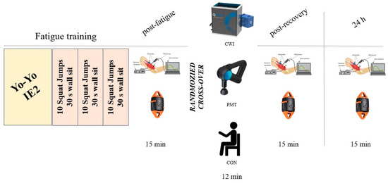 Every session included a fixed standardized fatiguing protocol and a randomized recovery intervention. The sequence of recovery intervention was randomized by a researcher not involved in the outcomes assessment, by drawing a card identifying the order of the interventions. The recovery-associated outcomes were assessed within 15 min from the ending of the fatiguing protocol (post fatigue), within 15 min after the recovery intervention (post recovery), and at 24 h. All the participants were tested at the same time of the day, in the afternoon. Participants were asked to avoid any strenuous physical activity in the 24 h before the measurements, and to refrain from food, smoking, coffee, and energy drinks in the 2 h before the fatiguing protocol. To reduce the influence of hydration status on the assessed outcomes [17], all the participants were instructed to consume 500 mL of plain water 30 min prior to the fatiguing protocol, and they were allowed to consume plain water ad libitum during all the experimental sessions. Before the fatiguing protocol, a 10 min warm-up was allowed and encouraged.