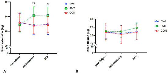 Effects of cold water immersion (CWI, circles, blue), percussive massage therapy (PMT, squares, green), and passive rest (CON, triangles, red) on (A) isometric knee extension (kg) and (B) isometric knee flexion (kg), post-fatigue protocol, post-recovery intervention, and at 24 h. Time × intervention analysis of variance on 16 participants: # significant difference between PMT and CON; $ significant difference between post-treatment and post-fatigue for PMT. Significance for p < 0.05.