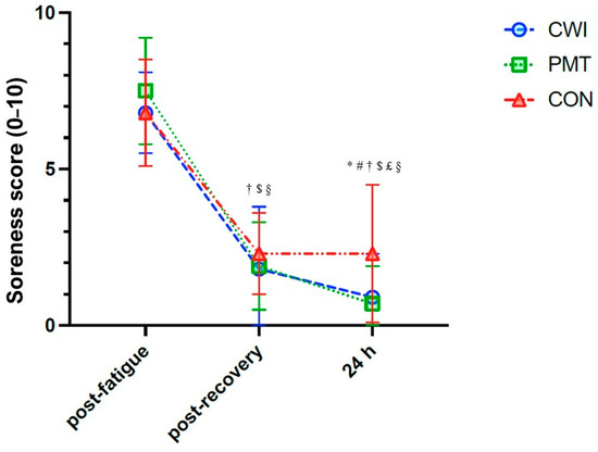 Effects of cold water immersion (CWI, circles, blue), percussive massage therapy (PMT, squares, green), and passive rest (CON, triangles, red) on muscle soreness perception (score 0–10), post-fatigue protocol, post-recovery intervention, and at 24 h. Time x intervention analysis of variance on 16 participants: * significant difference between CWI and CON; # significant difference between PMT and CON; † significant difference between post-treatment and post-fatigue for CWI; $ significant difference between post-treatment and post-fatigue for PMT; £ significant difference between 24 h and post-treatment for PMT; § significant difference between post-treatment and post-fatigue for CON. Significance for p < 0.05.