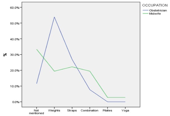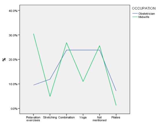 This study highlights healthcare professionals’ (midwives and obstetricians) attitudes and their practices regarding their recommendations on exercise in the first trimester of pregnancy, as well as the factors that influence or predict these attitudes. Half of the midwives and obstetricians who participated in the survey (54.89%) reported that they recommend exercise to pregnant women in the first trimester, mainly aerobic and relaxation exercises rather than resistance/muscle strengthening exercises. Our results are consistent with those of other studies [,,] demonstrating that exercise counseling for pregnant women is provided in approximately half of the cases, and aerobic exercise usually seems to be preferred over resistance exercise. Furthermore, the proportion of participants in this study recommending exercise during pregnancy appears to be sometimes higher than in other studies [,], in which only a quarter of respondents seem to discuss exercise with most pregnant women, and sometimes lower, e.g., when compared with the results of the Santo et al. study [].