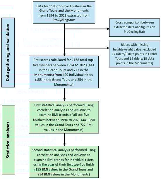 Due to the scarcity of accessible anthropometric data formally and systematically disclosed by teams or riders, we collected information from the website ProCyclingStats [35]. This website displays details on elite-level cycling from various sources, including individual riders, teams, and community contributors (email communication ProCyclingStats, October 2022). In March 2024, one member of the research team gathered data from ProCyclingStats for each top five finisher in every Grand Tour and Monuments race from 1994–2023 (note that the 2020 edition of the Paris–Roubaix was cancelled due to COVID-19 restrictions). This process entailed manually collecting publicly available information about the cyclist’s name, weight (kg), height (cm), year of birth, first year of top five entry, and race year from ProCyclingStats. Subsequently, two members of the research team cross-referenced these extracted data with the values displayed on ProCyclingStats to uphold accuracy and verify collated figures.