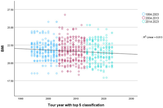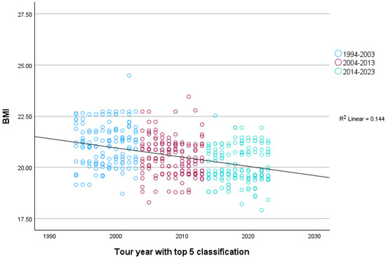 When comparing the three decades (1994–2003; 2004–2013; 2014–2023), a one-way ANOVA revealed a main effect of tour year of a top-five position, F (2, 438) = 40.10, p < 0.001, η2p = 0.16, 95% CI [0.10, 0.21]. The observed effect was large. Post-hoc tests showed that there was a statistically significant decrease in average BMI from each decade to the next (1994–2003: M = 21.08, SD = 1.01; 2004–2013: M = 20.53, SD = 0.91; 2014–2023: M = 20.10, SD = 1.02), all ps < 0.001.