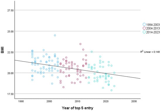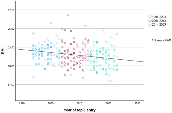 Correlation analyses were performed to examine the association between year of a top-five standing (or year of first top-five standing) and BMI. One-way ANOVAs were calculated to investigate how the BMI values of the riders compare across the three decades included in the analyses (1994–2003; 2004–2013; 2014–2023). Effect sizes are reported with small, medium, and large effect sizes corresponding to 0.10, 0.30., and 0.50 for Pearson’s r, 0.20, 0.50, and 0.80 for Cohen’s d, and 0.01, 0.06, and 0.14 for η2p [36].