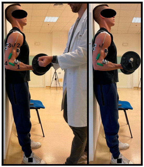 The protocol for each experimental task initially included a warm-up consisting of three sets of eight repetitions each, using a load equivalent to 50% of the individual’s one-repetition maximum (1RM), with a 2 min rest between each set. Next, the main exercise required participants to keep their arm flexed at a 90° angle while holding a dumbbell with a supine grip, loaded to 80% of their 1RM, on the dominant side of the body. During execution, the back and head were kept in contact with a vertical wall, with the feet shoulder width apart and firmly planted on the floor. The dumbbell was held with the dominant arm while the opposite arm remained in a neutral position close to the body (