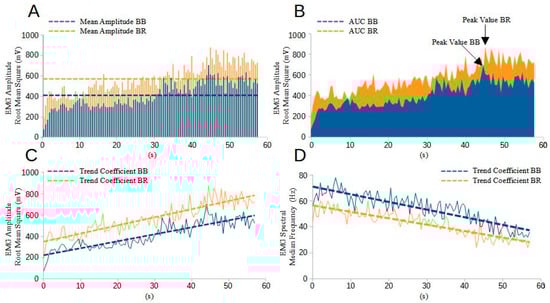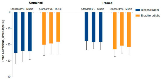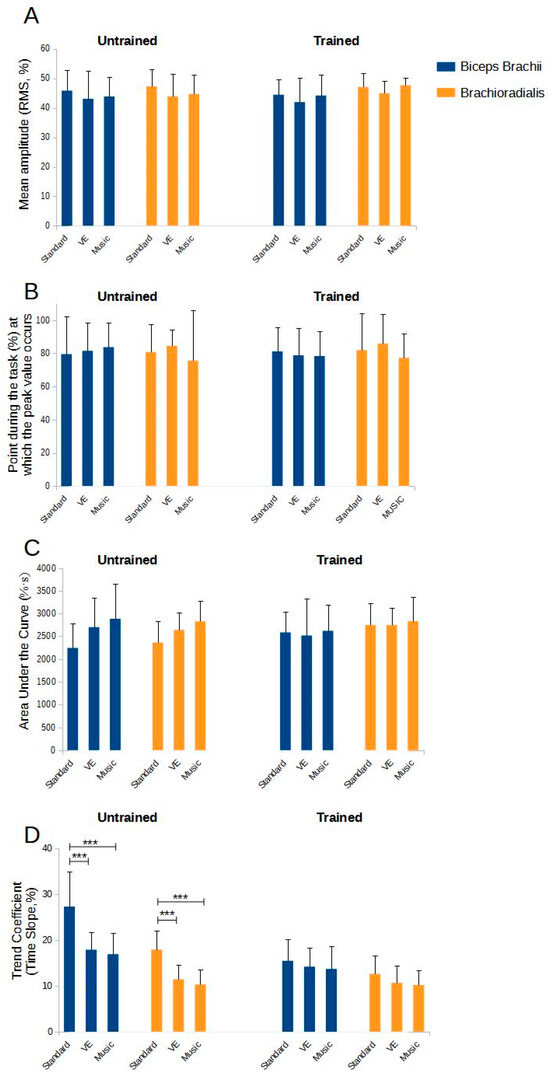 In trained participants, the phenomenon whereby the level of muscular excitation and myoelectric manifestations of fatigue remained stable, regardless of external stimuli, was due to the constancy of their task duration. In other words, the absence of significant variations in performance time of these participants was reflected in uniform EMG measurements across different experimental conditions. In contrast, a significant variation in task duration in response to stimuli was observed in untrained participants. However, despite these variations, the analysis carried out showed no changes across the three conditions of the mean amplitude, peak value, and AUC, indicating a similar level of neuromotor engagement, leading to a similar level of myoelectric manifestations of fatigue. Interestingly, when feedback was provided, either through VE or the use of music, there was a significant reduction in the time slope of the trend coefficient compared to the control environment without feedback for both muscles tested (time slope for BB −9% for VE and −10% for music, and time slope for BR −7% for VE and −8% for music).