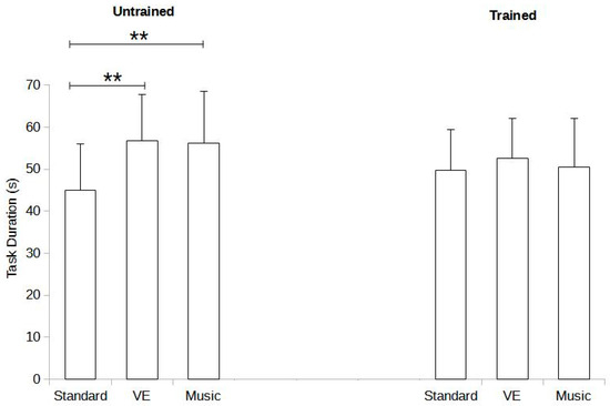 The untrained population increased their physical endurance, as evidenced by a longer task duration, when exposed to either VE or self-selected music. Specifically, the mean task duration without external stimuli was 45 s. This duration increased by 12 s when the task was performed with VE and by 11 s when the task was performed with music.