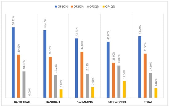 Relative observed frequencies (OF1Q%, OF2Q%, OF3Q%, OF4Q%) for each sport and total sample (RAEOS model).