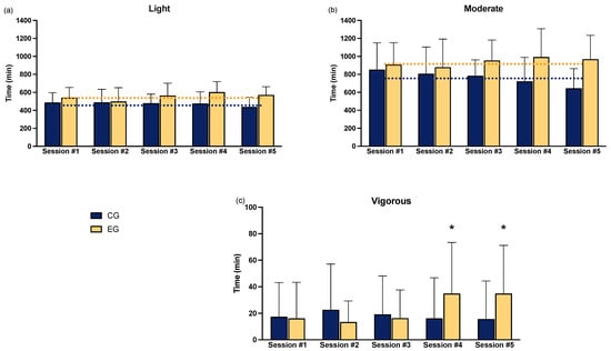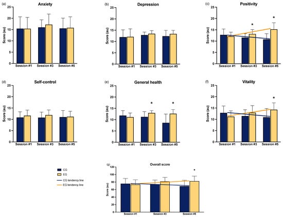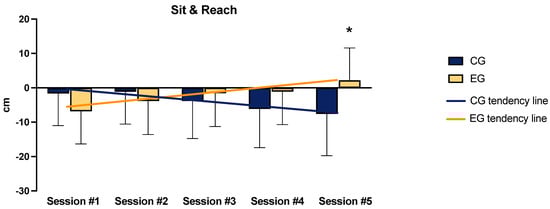 | Session #5 | EG | 6.1 ± 2.7 | 5.4 ± 3.6 * | 8.3 ± 4.1 * | 53.0 ± 8.8 | 2.2 ± 9.4 * | 57.1 ± 10.4 |