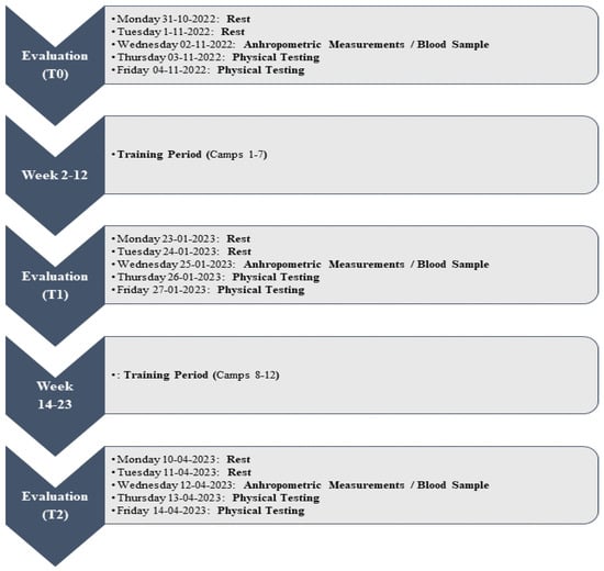 Longitudinal monitoring of the Tunisian U20 men’s 15-a-side rugby national team was carried out during the preparatory period for the U20 African Cup Barthés Trophy (Kenya, 22–30 April 2023). Preparation for the tournament lasted for 24 weeks (early November to mid-April), during which 12 training camps were held in Tunisia at the same venue that was affiliated with the Rugby Federation. Three evaluation sessions were carried out during this period: at the beginning (T0), in the middle (T1) and at the end of the season (T2). Assessments included anthropometric measurements, physical fitness tests and monitoring of muscle damage markers and changes in serum BDNF levels (Figure 1).