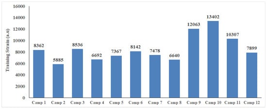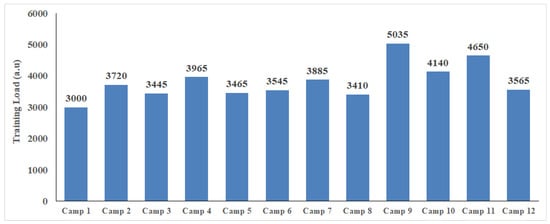 The training loads over the season are shown in Table 2 and Figure 2. There were no differences in training load between the two evaluation periods (p > 0.05, Table 2). The training strain per camp is presented in Figure 3.