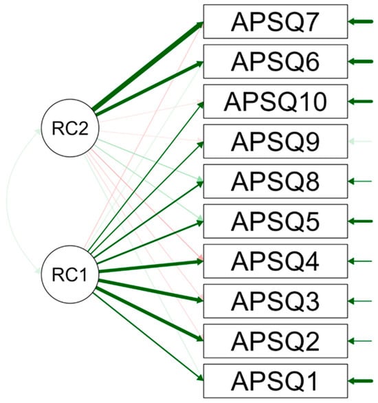Figure 1 illustrates this using a path diagram showing the relationships between the individual APSQ elements and the two underlying factors. The diagram illustrates that APSQ1–APSQ5, APSQ8, APSQ9, and APSQ10 load more heavily on Factor 1 (RC1), while APSQ6 and APSQ7 load more heavily on Factor 2 (RC2).