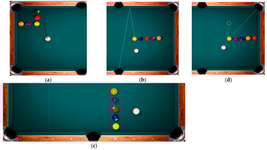 The pedagogical tests for billiard players with various types of musculoskeletal impairments (n = 16) consist of technical and tactical exercises: basic shots without cue ball positioning for the next ball (a), difficult shots without cue ball positioning for the next ball (b), basic shots with cue ball positioning in a specific area (c), difficult shots involving cue ball positioning to the next object ball (d).