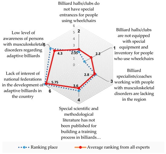 A comprehensive list of primary challenges impeding the development of adaptive billiards was extrapolated from respondents’ answers in 2023 to analyze the survey data systematically. These challenges were subsequently categorized into six main reasons contributing to the observed low activity levels among individuals with disabilities in adaptive billiards. Subsequently, these identified factors were incorporated into a matrix of experts’ assessments involving 20 experts. This matrix facilitated the determination of the most critical elements negatively influencing the integration of people with musculoskeletal disorders into the sports realm, providing valuable insights for further investigation and intervention strategies. A meticulous analysis of expert assessments was conducted to ascertain the collective expert opinion on prevalent issues in adaptive billiards (refer to Table 1) that impede the effective progression of pool training and competitive performance for wheelchair users. To facilitate this analysis, a matrix delineating each expert’s ratings of ranked factors was devised (refer to Table 2).