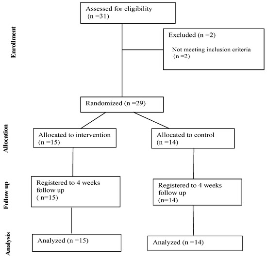 After 4 weeks, all 29 participants were randomized and completed the follow-up. Table 1 illustrates the age stratification of the participants within the groups.