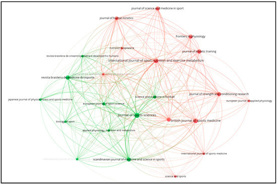Figure 3 shows the bibliographic coupling network of sources. This analysis utilized two constraints: (a) only sources with at least two documents and (b) only sources that are connected to each other. The network visualization reveals how various academic journals are interlinked based on shared references. Prominent journals such as the Journal of Sports Sciences, the British Journal of Sports Medicine, and the International Journal of Sport Nutrition and Exercise Metabolism exhibit significant connections, indicating their influential role and frequent citation within this research area. The colors red and green in the network represent different clusters of journals that are closely related based on shared references, with each color indicating a distinct group of sources that exhibit stronger bibliographic coupling within their cluster.