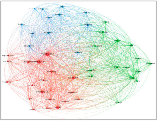 Figure 4 presents the co-citation network of authors associated with research on soccer in high temperatures. This analysis was conducted using authors as the unit of analysis and included only those with at least 30 citations. The network visualization illustrates the relationships and frequency of co-citations among authors, highlighting key researchers who frequently appear together in the literature. Prominent authors such as Maughan R.J., Shirreffs S.M., and Mohr M. are central nodes in the network, indicating their significant influence and widespread recognition in this field of research. The different colors (red, blue, and green) represent distinct clusters of authors who are more frequently co-cited together, reflecting specific research areas or collaborations within the broader field.