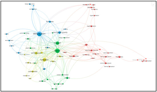 From the co-occurrence analysis of the author keywords, the map in Figure 5 emerged, showing 4 clusters. The items in the red cluster pertain to physical health and safety, especially concerning heat and thermal conditions. The yellow cluster involves performance, hydration, and physiological mechanisms. The green cluster relates to monitoring physiological mechanisms in soccer. Finally, the blue cluster seems to focus on how various factors, such as nutrition, fluid intake, and cooling techniques, can affect athletes’ wellness and competitiveness, with dehydration being the central pillar. Based on the key areas highlighted in the identified clusters, the following three topics will be covered in the subsequent sections of the article: (a) the physiology and health of soccer players, (b) performance impacts, and (c) strategies to prevent negative consequences. Forty articles were used to conduct the literature review. The articles were selected based on their direct relevance to the three topics, ensuring that existing and up-to-date knowledge on these topic areas is comprehensively covered.