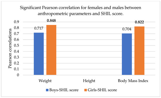 Significant Pearson correlation for females and males between the anthropometric parameters and SHIL score. The bold values are different from 0 with a significance level alpha = 0.05.