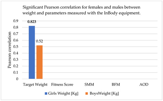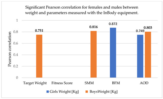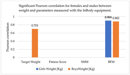 Significant Pearson correlation for females and males between weight and parameters measured with the InBody equipment. The bold values are different from 0 with a significance level alpha = 0.05.
