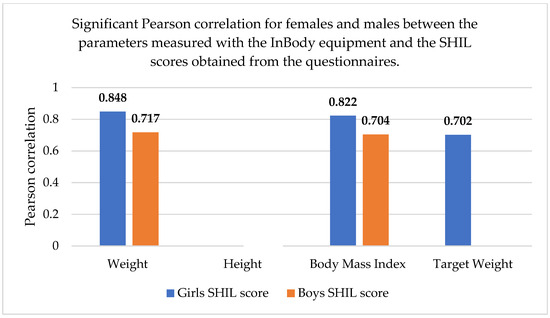 We also performed a correlation analysis between the body composition parameters and the scores resulting from the application of the BSQ, Rosenberg, SHIL, and IPAQ questionnaires. The results show that for females, Pearson correlations existed only between the SHIL score and weight (r = 0.848), body mass index (r = 0.822), and target weight (r = 0.702). For males, correlations were also observed between the SHIL score and weight (r = 0.717), as well as body mass index (r = 0.704). No correlations were found between the other parameters.
