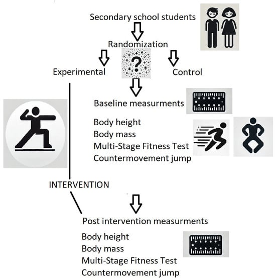 Participation was voluntary, and students could withdraw at any time. Both students and their parents or legal guardians were informed about this study’s objectives and procedures. Written informed consent was obtained from school principals, parents, and participants prior to the commencement of this study. Sample size estimation was conducted using G*Power software version 3.1 [29]. Based on the adopted study design—four study groups (boys and girls, each divided into experimental and control groups) and two repeated measurements (baseline and post-intervention)—with an effect size of 0.35, an alpha level of 0.05, and a power of 0.8 [30], the minimum required sample size was determined to be 28 participants. Participants were recruited from one secondary school. Initially, eight classes were enrolled in this project. Group assignments were made using simple cluster (class) randomization without replacement via an online tool (www.randomization.com, accessed on 16 January 2024). To minimize disruption to lesson schedules and the school’s daily operations, randomization was conducted based on the division of students into classes.