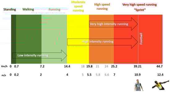 In a more isolated manner, some authors describe only four zones, using the following thresholds: <6 km/h (low), 6–18 km/h (moderate), 18–24 km/h (high), and >24 km/h (very high). In addition to the described ranges, it is important to analyze the terminology used; some authors employ the term HSR to denote speeds > 14.4 km/h (MSR) and VHSR for speeds > 20 km/h (HSR) [51,61,62].