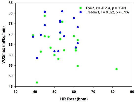 Relationship between resting heart rate (HR Rest) and VO2 peak for cycle and treadmill tests.