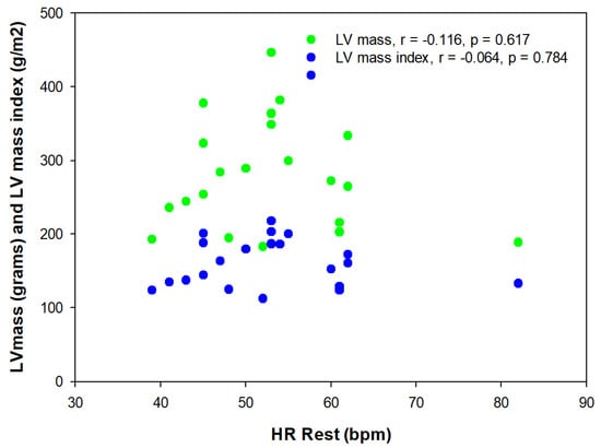 Relationship between resting heart rate (HR Rest) and left ventricular mass.