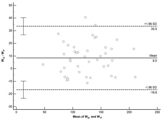 Unless otherwise specified, the results are presented as mean and standard deviation (M ± SD). The Kolmogorov–Smirnov test was used to validate the assumption of normality. One-way analysis of variance (ANOVA) was used to detect significant differences between WD and Wp. Bland and Altman plots [] were used to analyze the level of agreement between Wp and WD. In addition, Lin’s concordance correlation coefficient (CCC) [] was used to evaluate the degree to which pairs of observations fall on the 45° line through the origin. Furthermore, to describe the values of the concordance correlation coefficient, the scale proposed by Mcbride [] was used.