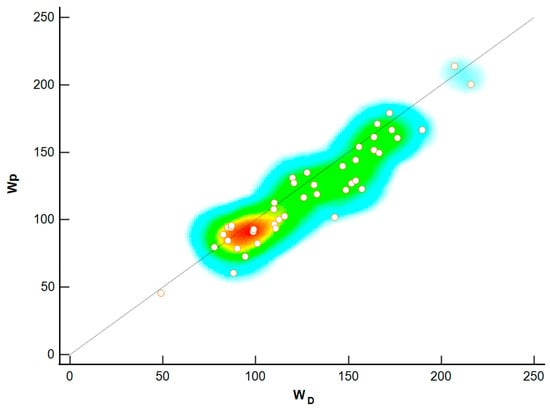 Lin’s concordance correlation coefficient (CCC) shows a high strength of agreement (Figure 2) between WD and Wp, with a concordance correlation coefficient = 0.95, 95% CI = 0.87 to 0.95, Pearson correlation (p) = 0.94, and bias correction factor (Cb) = 0.97.