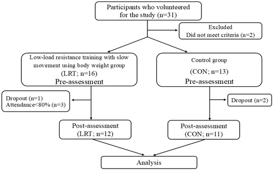 Thirty-one community-dwelling older Japanese women were recruited from the local community through printed advertisements. The inclusion criteria were Japanese women living independently in the community, who were able to complete the measurements and exercise intervention, as judged by the physician-in-charge. All recruits were informed of this study’s methods, procedures, and risks and provided written informed consent before participating. The exclusion criteria for this study were severe cardiovascular or cerebrovascular diseases, activity limitations due to bone or joint diseases within the past six months, lack of approval from their regular physicians, and inability to follow our instructions. Individuals who met these criteria were excluded, and twenty-nine participants qualified for this study. The participants were assigned to either an intervention group that performed low-load resistance training with slow movement using the body weight (LRT group; n = 16) or a control group (CON group; n = 13). Assessments were conducted to evaluate all participants’ body characteristics and physical/psychosocial-related parameters before (pre) and after (post) the 12-week intervention period. The LRT group participated in the exercise session during the intervention period, while the CON group maintained their daily routine without participating in the exercise. All participants were instructed to avoid engaging in other physical activities throughout the trial. Through the 12-week intervention, one participant in the LRT group dropped out of the exercise sessions for personal reasons, and two in the CON group were absent from the post-assessment. In addition, three participants in the LRT group were excluded from statistical analyses for having less than 80% attendance of the exercise sessions. Therefore, 12 participants in the LRT group (mean age: 67.3 ± 4.8 years) and 11 in the CON group (mean age: 69.4 ± 6.0 years) were included in the final analysis (Figure 1). The required sample size was calculated using G*power software (version 3.1.9.6, Düsseldorf, Germany) (ANOVA: repeated measures, within–between interaction) and with a medium effect size (partial η2 of 0.09) [30], α err prob of 0.05, and statistical power (1 − β err prob) of 0.80. The calculation indicated that 22 participants were needed (11 in each group). This study was conducted under the Declaration of Helsinki and was approved by the Ethics Committee for Human Experiments of Juntendo University (approval number: 2022-73). Experiments were conducted and data were collected from August 2022 to December 2022.