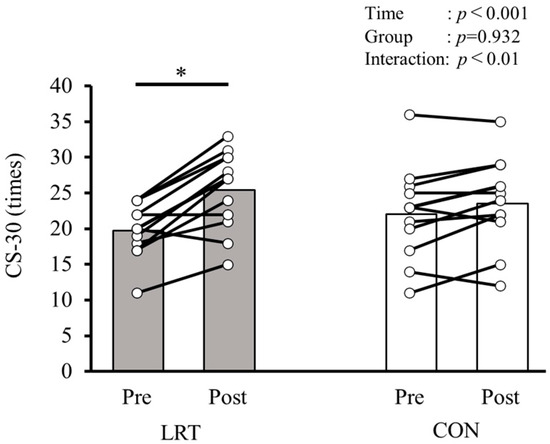 Figure 2 shows a comparison of CS-30 before and after the 12-week intervention in both groups. A significant group × time interaction (F = 9.503, p < 0.01, = 0.312) and main effect of time (F = 29.104, p < 0.001, = 0.581) were observed, while a main effect of the group (F = 0.007, p = 0.932, < 0.001) was not observed. When comparing the intervention effect of the LRT and CON groups using simple main effects analyses, a significant increase from pre to post in LRT was observed (pre: 19.8 ± 3.8 times, post: 25.5 ± 5.6 times; p < 0.001), but not in the CON group (pre: 22.1 ± 6.8 times, post: 23.6 ± 6.5 times; p = 0.124; Table 2).