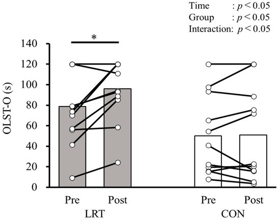 Comparison of OLST-O before and after the 12-week intervention in both groups. LRT, group that performed low-load resistance training with slow movement using the body weight; CON, control group; Pre, before intervention; Post, after intervention; OLST-O, one-leg standing balance test with eyes open. *, significantly greater than Pre (p < 0.01).