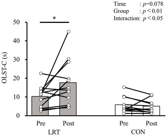Comparison of OLST-C before and after the 12-week intervention in both groups. LRT, group that performed low-load resistance training with slow movement using the body weight; CON, control group; Pre, before intervention; Post, after intervention; OLST-C, one-leg standing balance test with eyes closed. *, significantly greater than Pre (p < 0.01).
