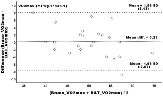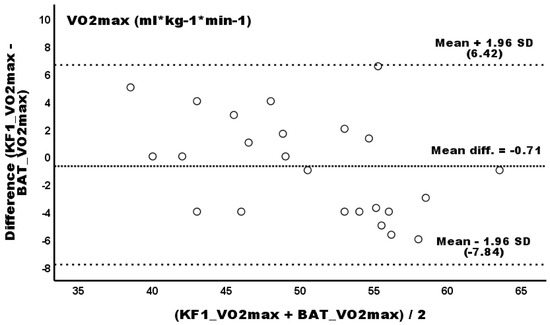 The Bland–Altman scatterplot of the VO2max agreement between the BAT and Bruce protocols is presented in Figure 2. The mean difference between the two methods yielded a value of 0.23, indicating no measurement bias (p > 0.05). Similarly to the BAT-KF1, a negative linear trend between the BAT and Bruce protocols was observed; however, no potential proportional bias was shown (β = −0.26; 95% CI −0.51–0.15; p = 0.087). The generated SEE of the VO2max was 3.75 mL * kg−1 * min−1. Similarly to the KF1 protocol, the linear regression equation to predict the relative VO2max from the Bruce protocol was as follows: VO2maxBRUCE (mL * kg−1 * min−1) = −3.996 + (1.075 * VO2maxBAT) (R2 = 0.72; p < 0.001). The slope coefficient between the BAT and KF1 protocols was b = 1.10 with a 95% CI (0.80, 1.30), while the intercept coefficient was a = −1.05 with a 95% confidence interval (−10.17, 9.90), indicating that the BAT protocol yielded similar measurements to the Bruce protocol.