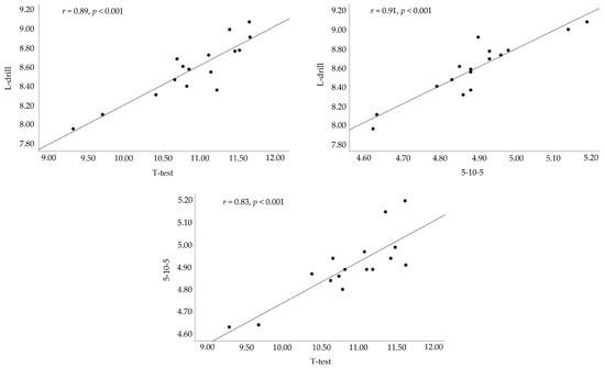 t-test, L-drill and 20-yard shuttle) in a random order. These tests have previously demonstrated high test–retest reliability in team-sport athletes, with reported intraclass correlation coefficients (ICCs) of 0.95 for the