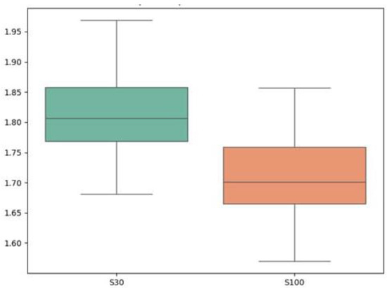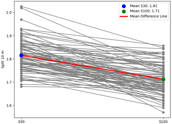 Paired difference plots (Figure 4) and box plots (Figure 5) illustrate the differences in performance metrics between the two starting procedures. The paired difference plots clearly show the individual changes between S30 and S100 for each athlete, with the mean difference line highlighting the overall trend. The box plots also confirm the differences in distribution between the two starting conditions.