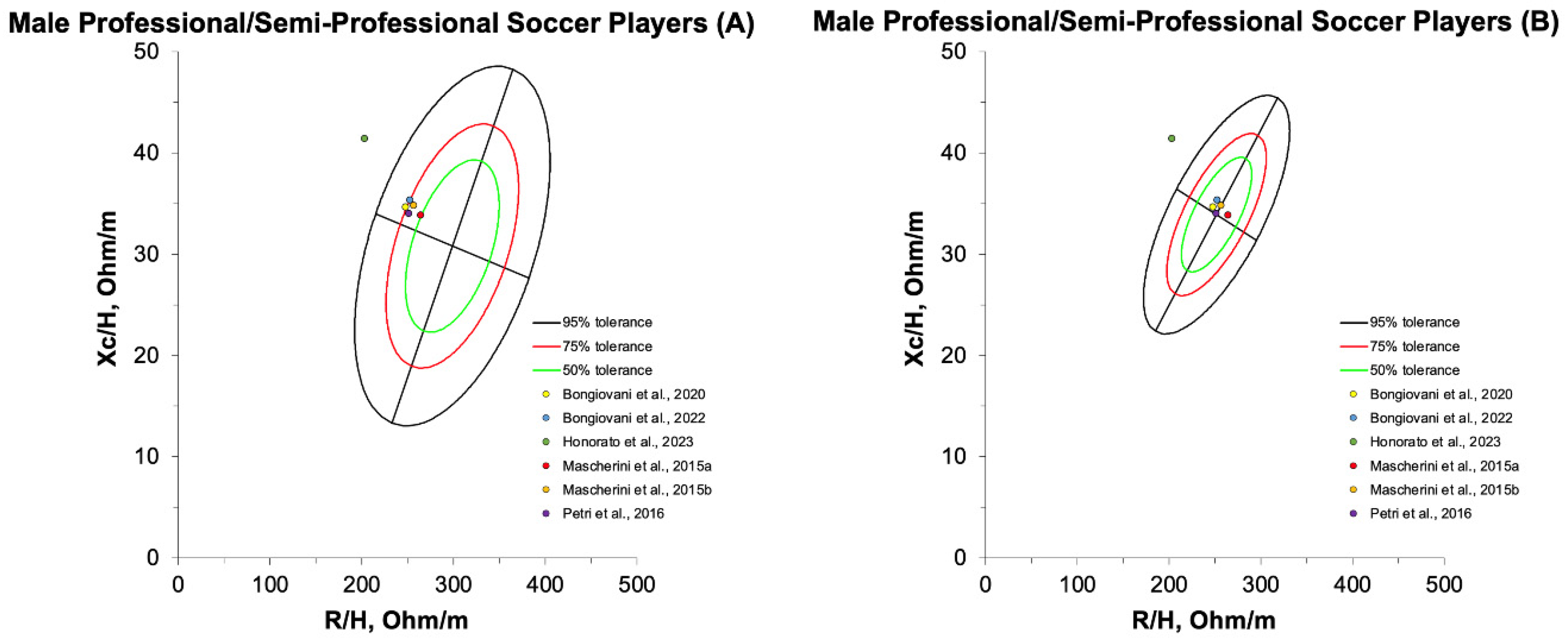 - Bongiovanni, T.; Mascherini, G.; Genovesi, F.; Pasta, G.; Iaia, F.M.; Trecroci, A.; Ventimiglia, M.; Alberti, G.; Campa, F. Bioimpedance Vector References Need to Be Period-Specific for Assessing Body Composition and Cellular Health in Elite Soccer Players: A Brief Report. J. Funct. Morphol. Kinesiol. 2020, 5, 73. [Google Scholar] [CrossRef]