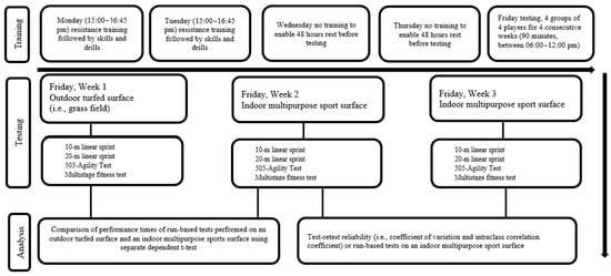 A within-participant, repeated measure, crossover design was employed for this study, which occurred at the end of the in-season training phase of the season. Players were partaking in three gym sessions (resistance training occurred on Monday, Wednesday, and Friday) and two field sessions (skills and drills training occurred on Monday and Wednesday) per week. Training occurred as follows: Monday (resistance training 15:00–15:50 followed by a field session 15:50–16:45), Wednesday (resistance training 15:00–15:50 followed by a field session 15:50–16:45), and Friday (06:00–07:00, resistance training). Data collection for this study over three weeks. During the three-week data collection period, participants trained as specified on Monday but did not train on the Wednesday (to allow for 48 h rest), and the Friday training session was replaced by testing (06:00–12:00). This modification to the training schedule allowed for a 48 h rest prior to each training session and testing sessions (Figure 1). Testing occurred in the following order: Week 1: Run-based tests performed on an outdoor turfed surface (i.e., a grass field). Weeks 2 and 3: Run-based tests performed on an indoor multipurpose sports surface. The results of run-based tests conducted during weeks 2 and 3 allowed for the examination of test–retest reliability of each run-based test on an indoor multipurpose sports surface (Aura Sports, Polyurethane Flooring; Ipswich, QLD, Australia). The results of the run-based tests conducted during weeks 1 and 2 allowed for the comparison of tests performed on an outdoor turfed surface and an indoor multipurpose sports surface. It is common practice for the reliability of run-based tests to be evaluated on different days within a timeframe of seven days to limit or prevent results of subsequent tests from being influenced by maturation in younger cohorts or a training effect in those undertaking structured training [16].