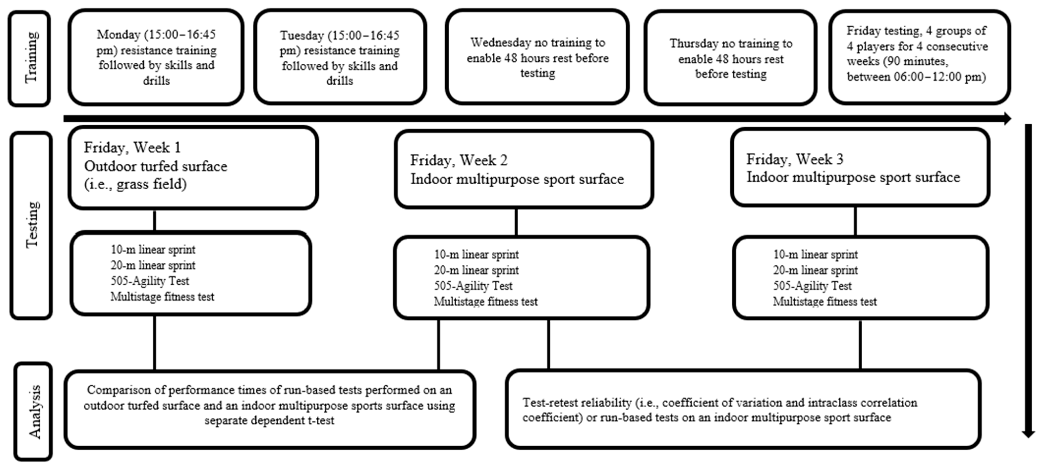 Test | n | Outdoor Turfed Surface | Indoor Multipurpose Sport Surface | Comparison of Run-Based Tests Conducted During Week 1 and Week 2 | ||||