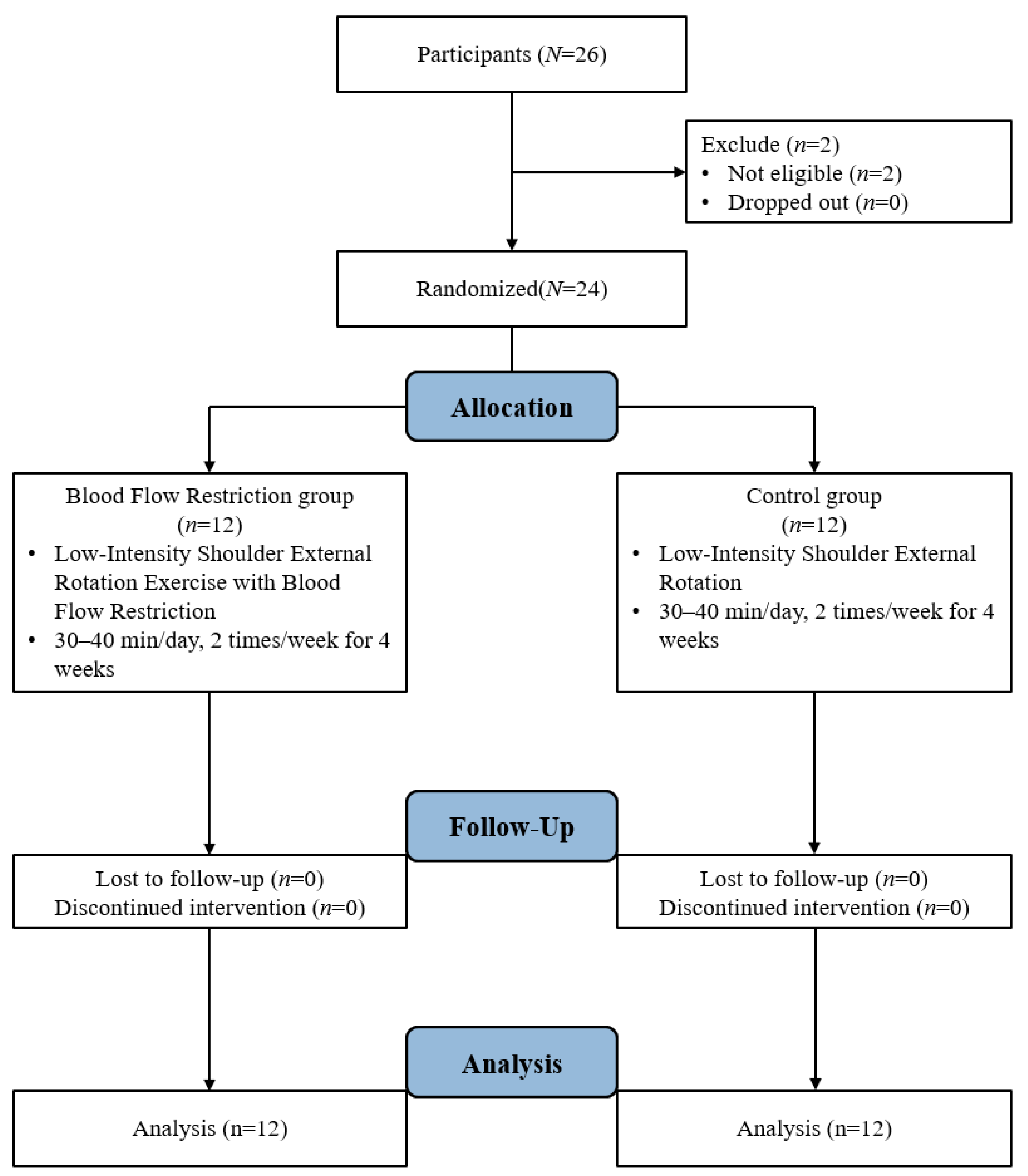 - Jønsson, A.; Johansen, C.; Rolving, N.; Pfeiffer-Jensen, M. Feasibility and estimated efficacy of blood flow restricted training in female patients with rheumatoid arthritis: A randomized controlled pilot study. Scand. J. Rheumatol. 2021, 50, 169–177. [Google Scholar] [CrossRef]