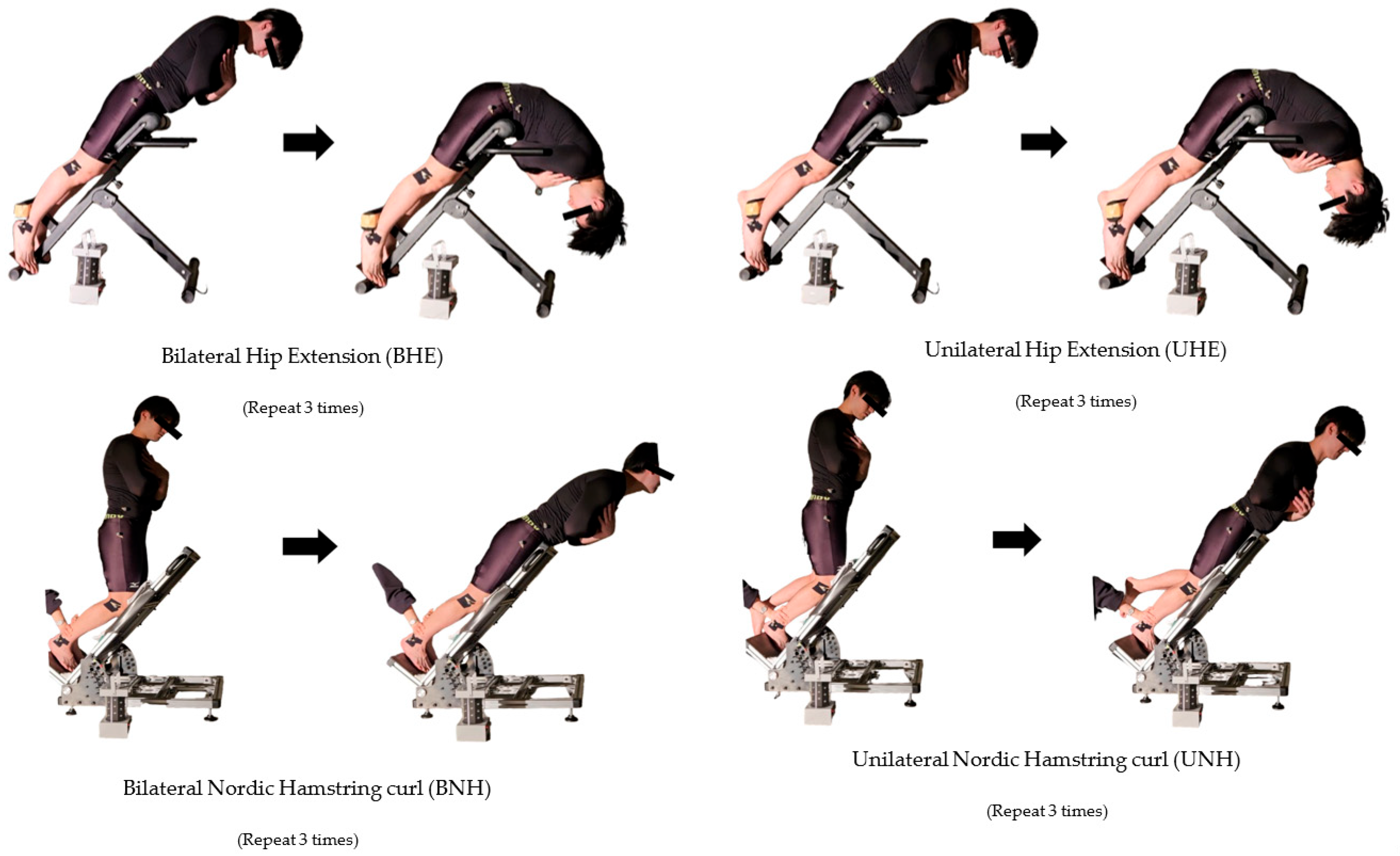 - Keerasomboon, T.; Jamkrajang, P.; Limroongreungrat, W.; Chrunarm, T.; Soga, T.; Hirose, N. Comparing the hamstring muscle activity between injured and non-injured sides during a variety of Nordic hamstring exercises. PLoS ONE 2025, 20, e0325392. [Google Scholar] [CrossRef]