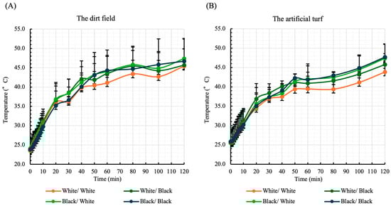 On a dirt field, the maximum shin temperature of a mannequin wearing white shoes was 43.8 ± 1.81 °C with white socks and white baseball stockings, and 51.9 ± 3.27 °C with black socks and black baseball stockings (Figure 3A). For mannequins wearing black shoes on the same field, the maximum shin temperature was 45.9 ± 0.97 °C with white socks and white baseball socks, and 50.4 ± 1.81 °C with black socks and black baseball socks (Figure 3B).